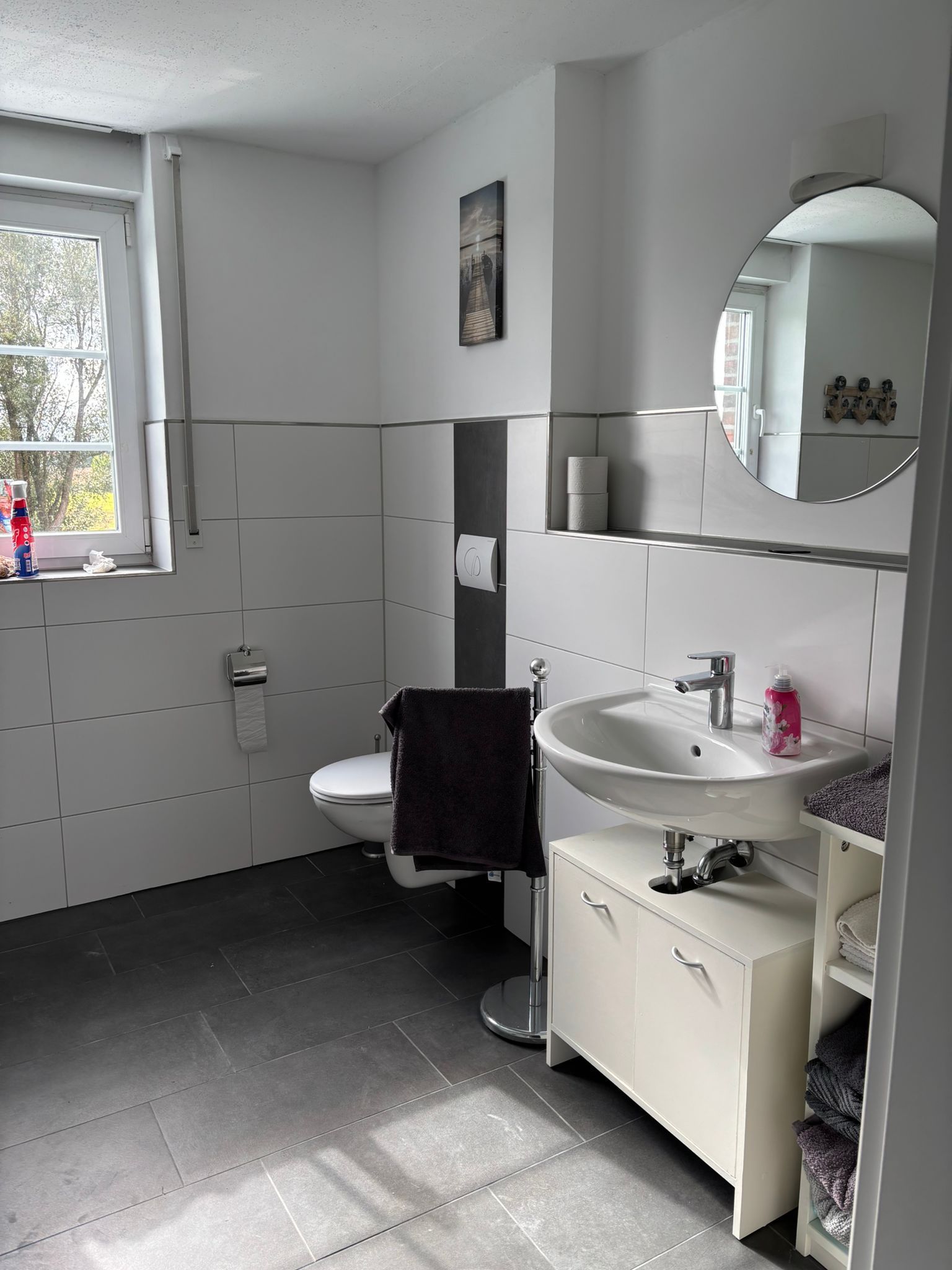 Das modern gestaltete Duschbad ist Ihre kleine Wellnessoase. Großzügig und mit Fußbodenheizung ausgestattet, finden Sie neben dem WC und Waschbecken auch eine moderne bodengleiche Dusche. Bitte beachten Sie jedoch, dass keine Hygienartikel/feuchtes Toilettenpapier in dem WC entsorgt werden. Das Haus ist mit einer 3-Kammer Kläranlage ausgestattet, die nicht dafür ausgelegt ist Feuchttücher zu zerkleinern und dadurch zu Schaden kommen würde.